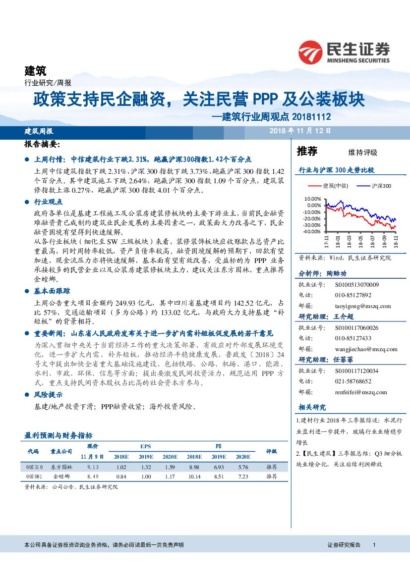民生证券:建筑行业周观点:政策支持民企融资,关注民营PPP及公装板块.pdf
