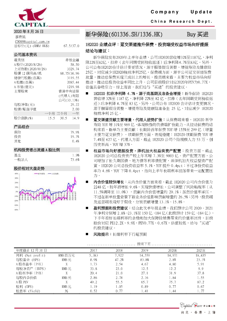 群益证券:新华保险(601336)-1H2020业绩点评:趸交渠道推升保费,投资端受权益市场向好提振.pdf
