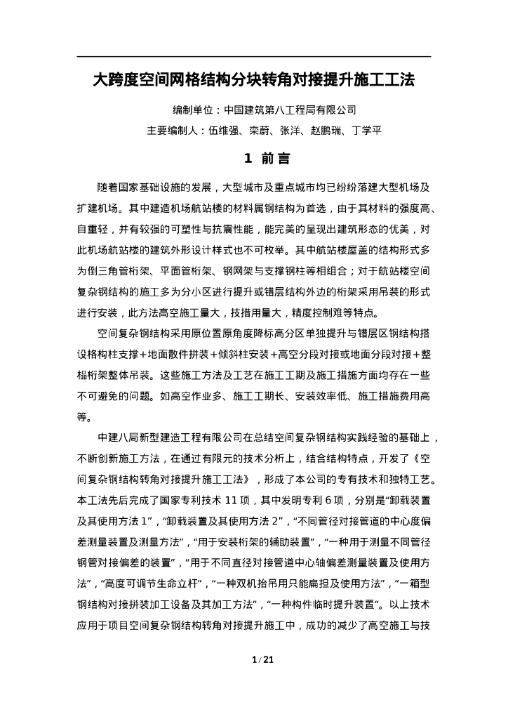 QHGF-2022049 大跨度空间网格结构分块转角对接提升施工工法.doc