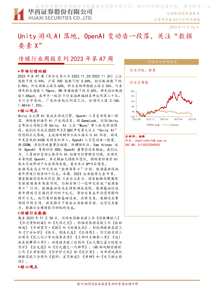 华西证券:传媒行业周报系列2023年第47周:Unity游戏AI落地,OpenAI变动告一段落,关注“数据要素X”.pdf