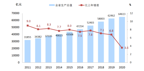 根据国家统一初步核算,2020年浙江省生产总值为64613亿元,按可比价格计算,比上年增长3.6%。分产业看,第一产业增加值2169亿元,增长1.3%;第二产业增加值26413亿元,增长3.1%;第三产业增加值36031亿元,增长4.1%。三次产业增加值结构为3.3∶40.9∶55.8。按照我国地区生产总值统一核算和数据发布制度规定,地区生产总值核算包括初步核算和最终核实两个步骤。经最终核实,2019年,浙江省生产总值现价总量为62462亿元,按可比价格计算,比上年增长6.8%,三次产业增加值结构为3.3∶42.1∶54.6。