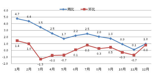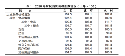 全年居民消费价格比上年上涨2.3%,其中食品类价格上涨9.5%。商品零售价格上涨1.2%。农业生产资料价格上涨6.1%。工业生产者出厂价格下降3.1%,购进价格下降4.1%。