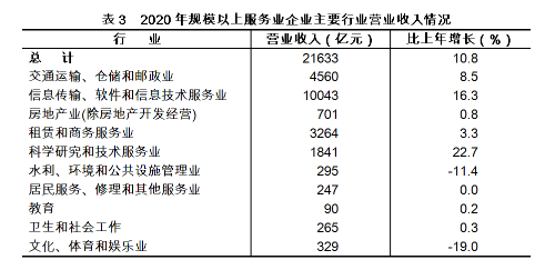 [3]辖区内年营业收入2000万元及以上服务业法人单位。包括:交通运输、仓储和邮政业,信息传输、软件和信息技术服务业,水利、环境和公共设施管理业三个门类和卫生行业大类。辖区内年营业收入1000万元及以上服务业法人单位。包括:租赁和商务服务业,科学研究和技术服务业,教育三个门类,以及物业管理、房地产中介服务、房地产租赁经营和其他房地产业四个行业小类。辖区内年营业收入500万元及以上服务业法人单位。包括:居民服务、修理和其他服务业,文化、体育和娱乐业两个门类,以及社会工作行业大类。