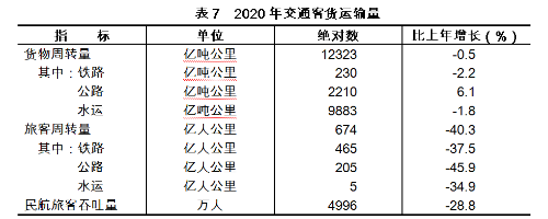 年末全省公路总里程12.33万公里,其中,高速公路5096公里,实现陆域县县通高速。共有民航机场7个,全年旅客吞吐量4996万人,其中发送量2523万人。铁路、公路和水运货物周转量12323亿吨公里,比上年下降0.5%;旅客周转量674亿人公里,下降40.3%。全省港口货物吞吐量18.5亿吨,增长6.0%[4],其中,沿海港口14.1亿吨,增长4.5%。宁波舟山港货物吞吐量11.7亿吨,连续12年居全球第一,集装箱吞吐量2872万标箱,连续3年全球第三。