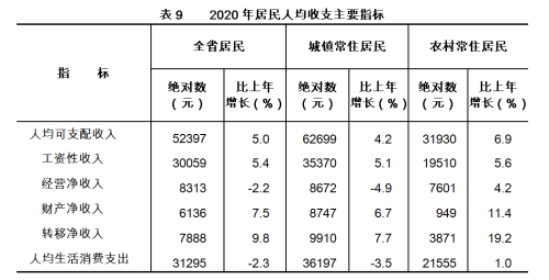 根据城乡一体化住户调查,全年全省居民人均可支配收入为52397元,比上年增长5.0%,扣除价格因素增长2.6%。按常住地分,城镇和农村居民人均可支配收入分别为62699和31930元,增长4.2%和6.9%,扣除价格因素分别增长2.1%和4.0%。全省居民人均可支配收入中位数[8]为46125元,增长4.4%。低收入农户人均可支配收入增长14.0%。