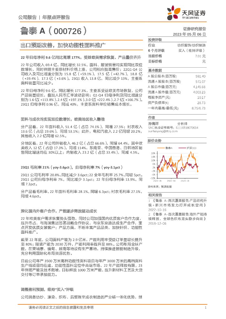 天风证券:鲁泰A(000726)-出口预期改善,加快功能性面料推广.pdf