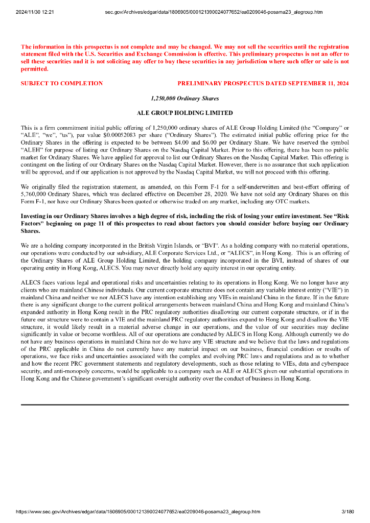 ALE Group Holding Limited美股纳斯达克IPO上市招股说明书.pdf