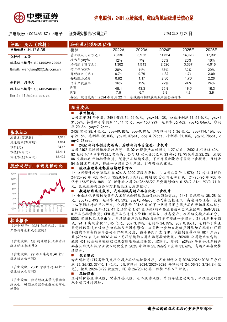 中泰证券:沪电股份:24H1业绩高增,激励落地后续增长信心足.pdf