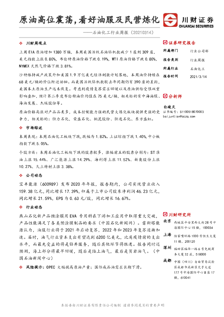川财证券:石油化工行业周报:原油高位震荡,看好油服及民营炼化.pdf