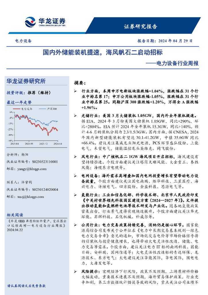 华龙证券:电力设备行业周报:国内外储能装机提速,海风帆石二启动招标.pdf