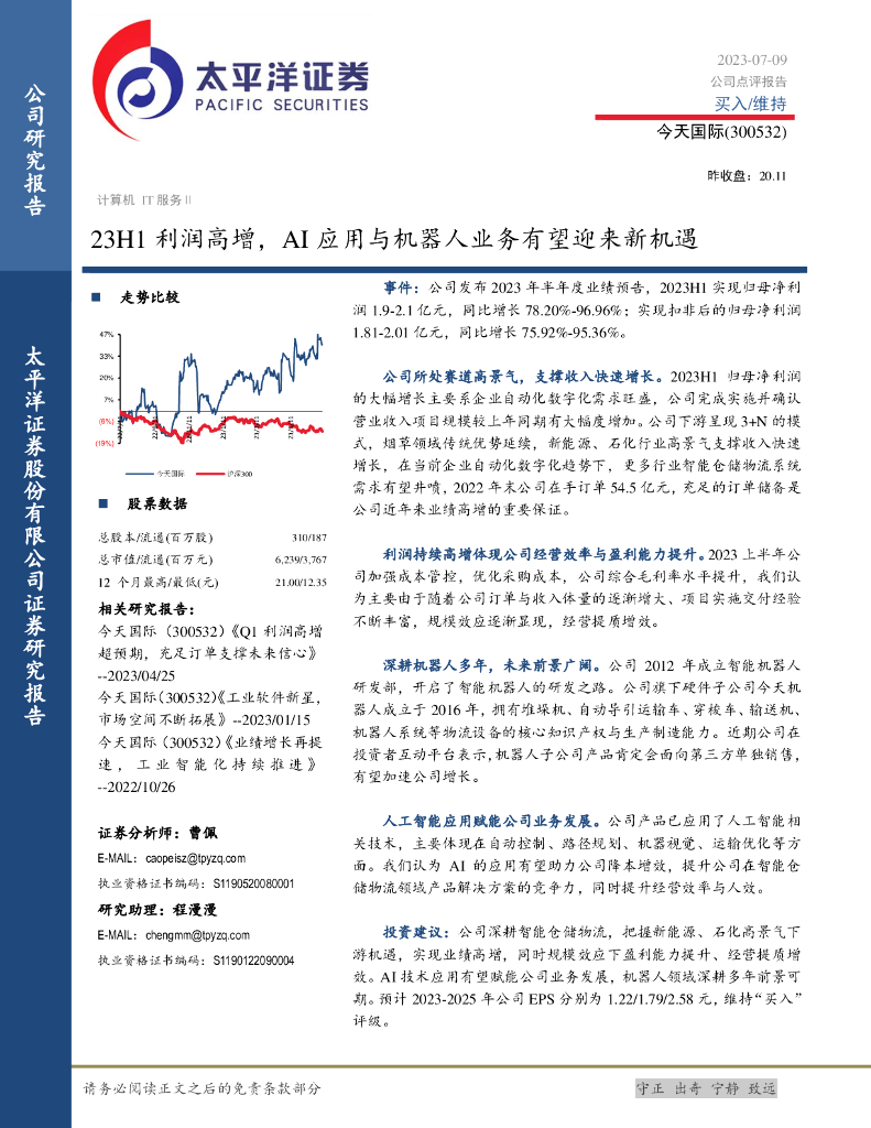 太平洋证券:今天国际(300532)-23H1利润高增,AI应用与机器人业务有望迎来新机遇.pdf