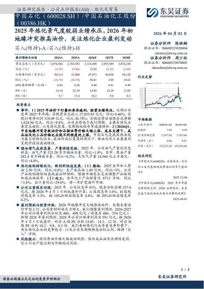 东吴证券:中国石化(600028)-2025年炼化景气度较弱业绩承压,2026年初地缘冲突推高油价,关注炼化企业盈利变动.pdf