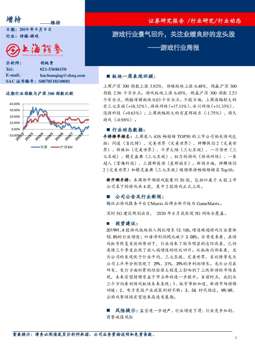 上海证券:游戏行业周报:游戏行业景气回升,关注业绩良好的龙头股.pdf