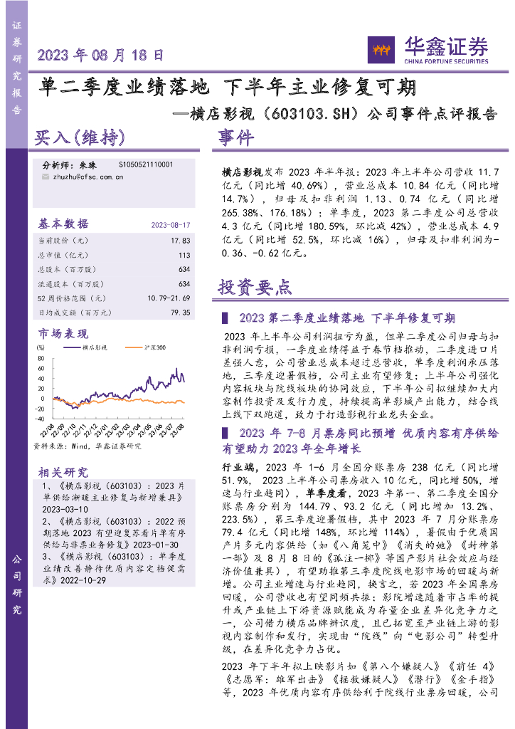 华鑫证券:横店影视(603103)-公司事件点评报告:单二季度业绩落地 下半年主业修复可期.pdf