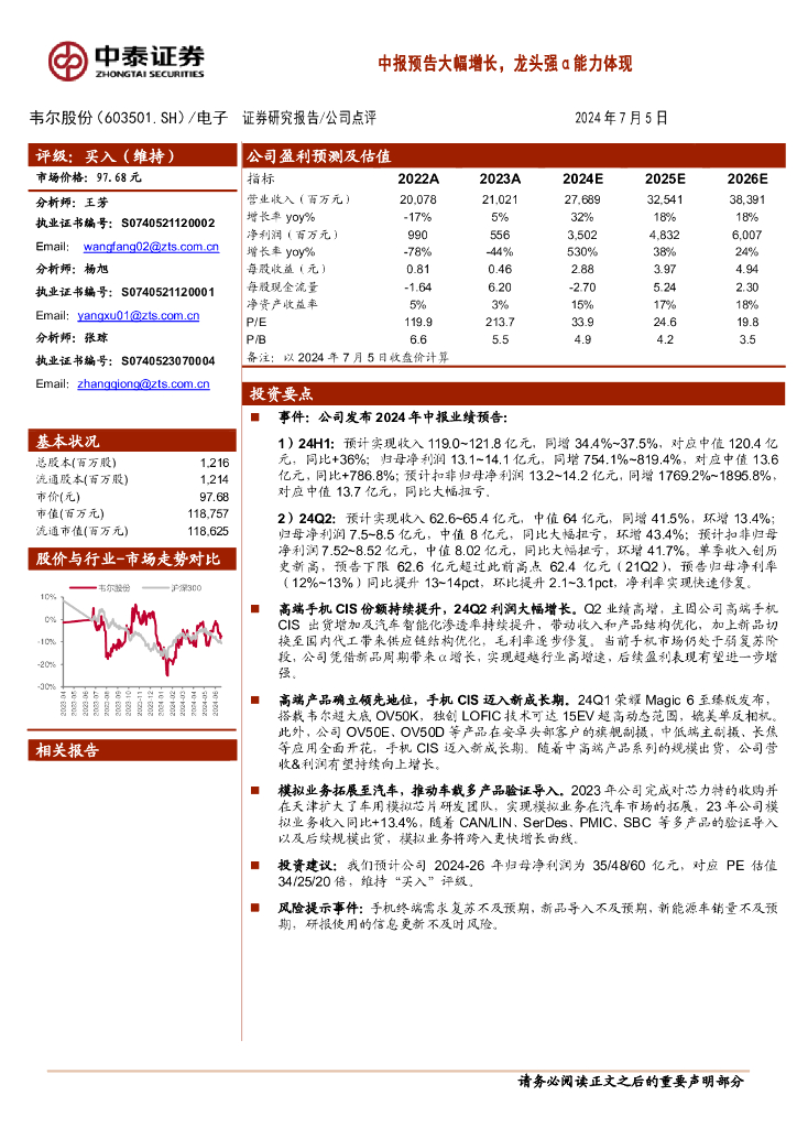 中泰证券:韦尔股份(603501)-中报预告大幅增长,龙头强α能力体现.pdf