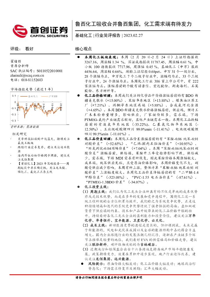 首创证券:基础化工行业简评报告:鲁西化工吸收合并鲁西集团,化工需求端有待发力.pdf