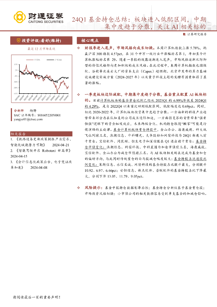 财通证券:计算机行业24Q1基金持仓总结:板块进入低配区间,中期集中度趋于分散,关注AI相关标的.pdf