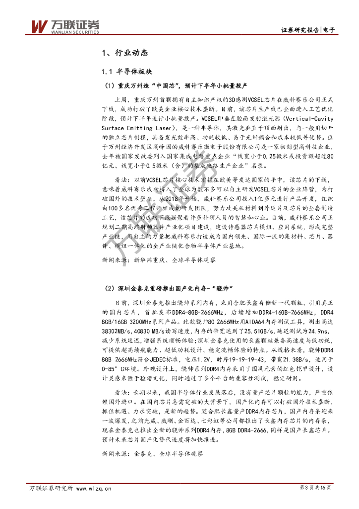 万联证券:电子行业周观点:重庆万州首颗3D感测VCSEL芯片下线,国产化替代成效显著.pdf