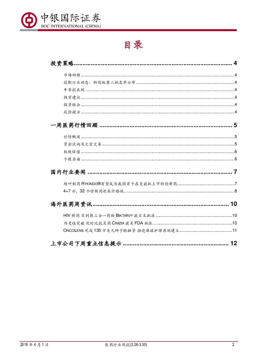 中银国际:医药行业周报:科创板第二批名单出炉,科技成长及创新型企业仍为主推方向.pdf