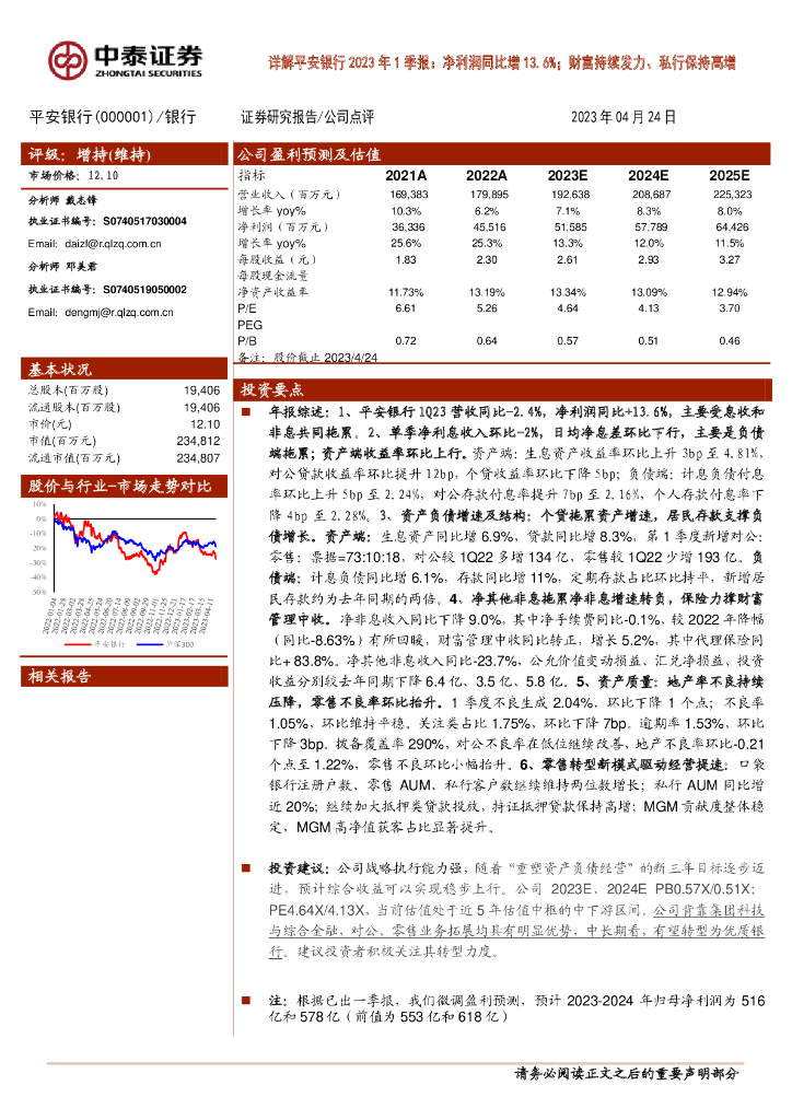 中泰证券:详解平安银行2023年1季报:净利润同比增13.6%;财富持续发力、私行保持高增.pdf