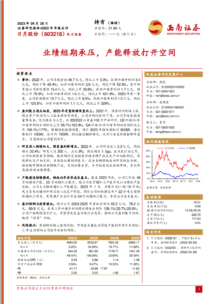 西南证券:日月股份(603218)-业绩短期承压,产能释放打开空间.pdf