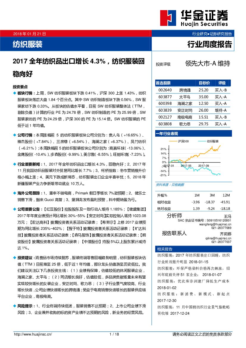 华金证券:纺织服装行业周度报告:2017全年纺织品出口增长4.3%,纺织服装回稳向好.pdf