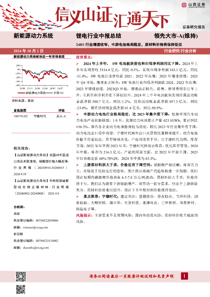 山西证券:锂电行业中报总结:24H1行业增速收窄,中游电池格局稳定,原材料价格将保持低位.pdf