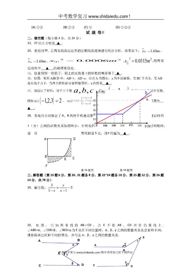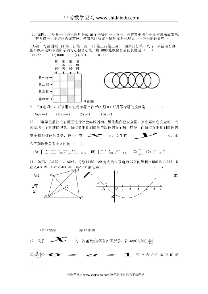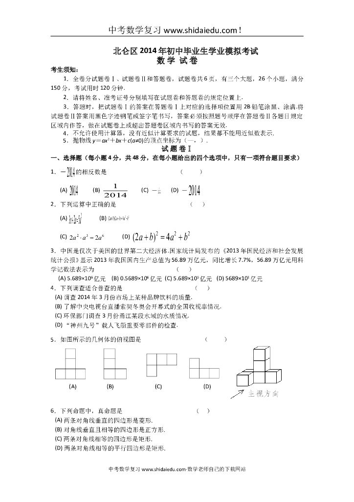 北仑区九年级数学中考(毕业生学业模拟考试)一模试卷附答题纸参考答案.doc