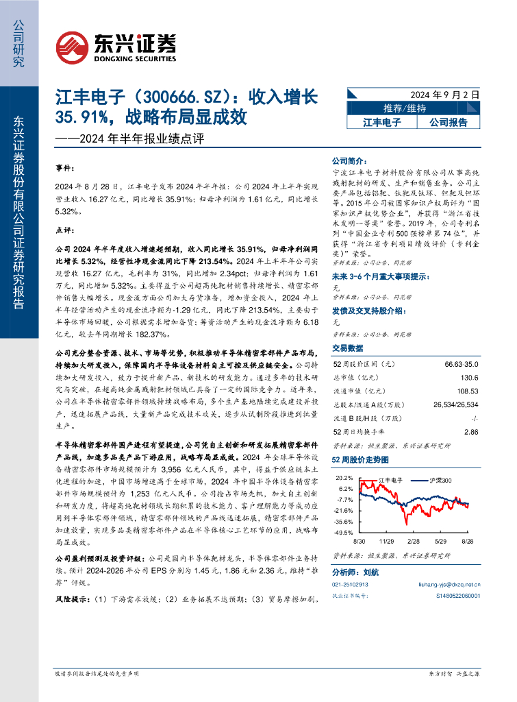 东兴证券:江丰电子(300666)-2024年半年报业绩点评:收入增长35.91%,战略布局显成效.pdf