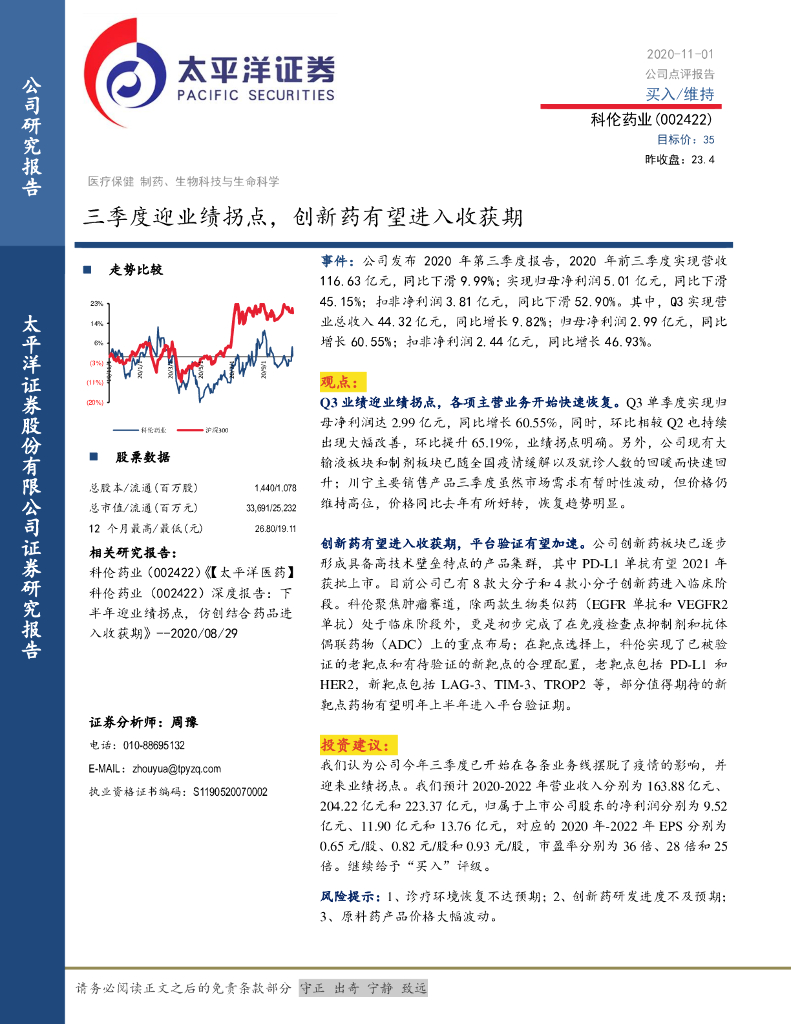 太平洋证券:科伦药业(002422)-三季度迎业绩拐点,创新药有望进入收获期.pdf