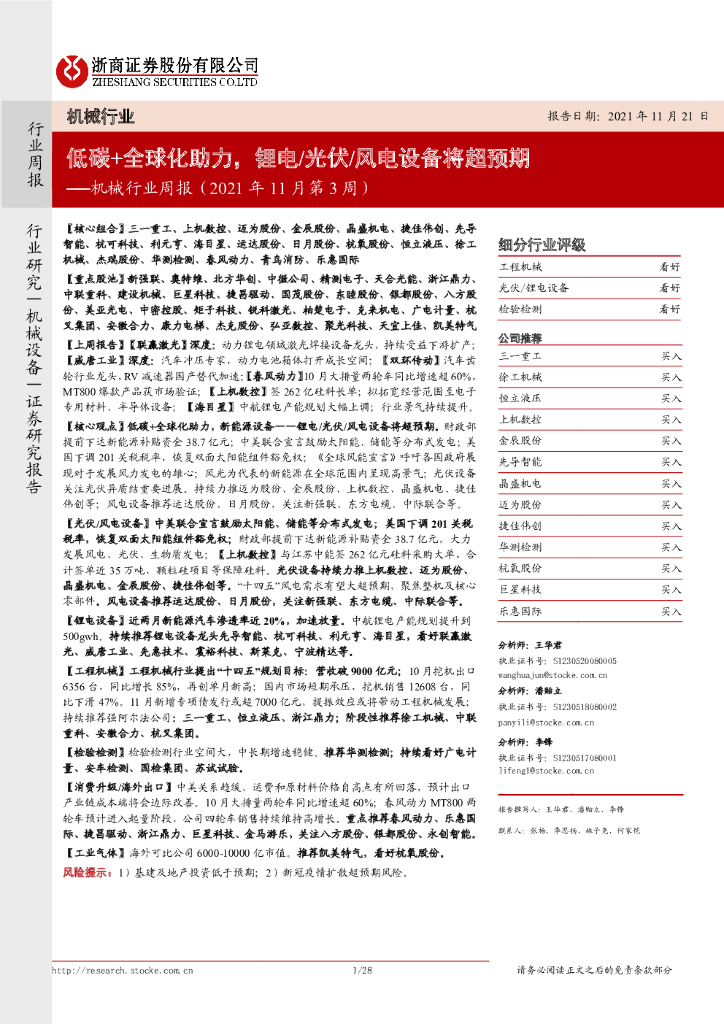 浙商证券:机械行业周报(2021年11月第3周):低碳+全球化助力,锂电/光伏/风电设备将超预期.pdf