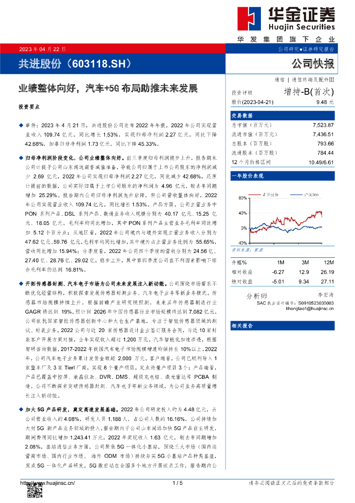 华金证券:共进股份(603118)-业绩整体向好,汽车+5G布局助推未来发展.pdf