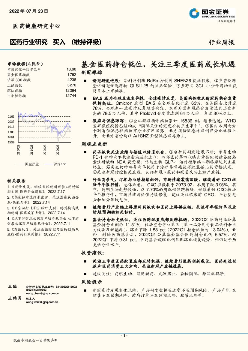 国金证券:医药行业研究:基金医药持仓低位,关注三季度医药成长机遇.pdf