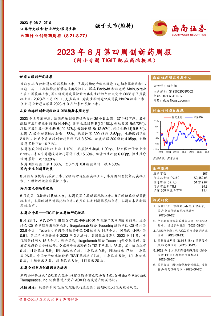 西南证券:2023年8月第四周创新药周报(附小专题TIGIT靶点药物概况).pdf