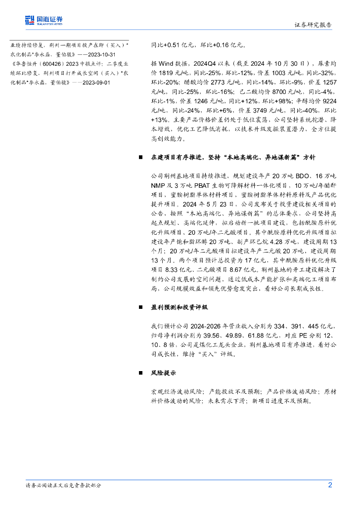 国海证券:华鲁恒升(600426)-2024年三季报点评:检修影响三季度业绩,荆州二期项目有序推进.pdf