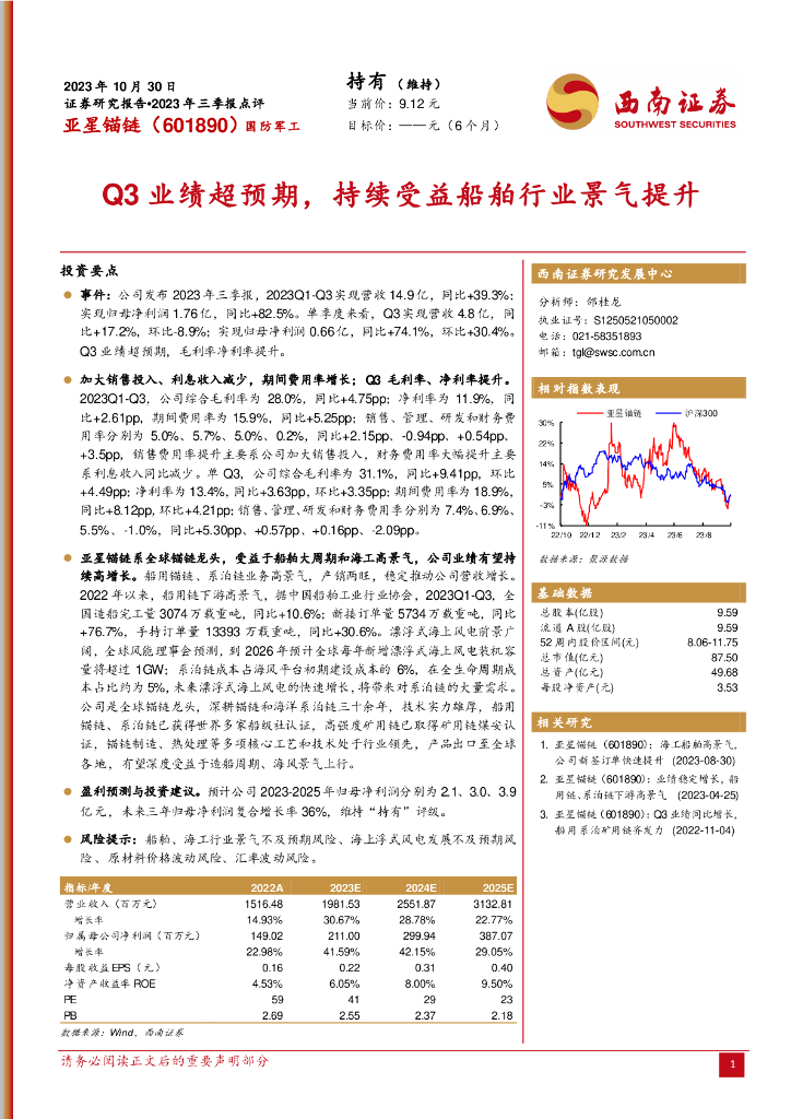 西南证券:亚星锚链(601890)-2023年三季报点评:Q3业绩超预期,持续受益船舶行业景气提升.pdf