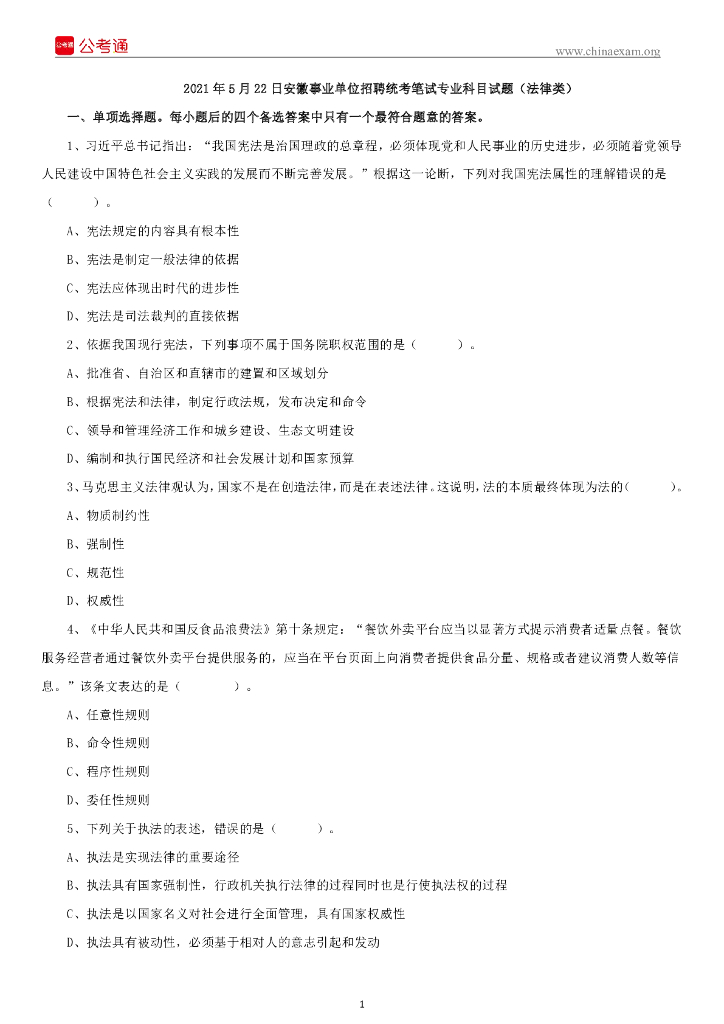 2021年5月22日安徽事业单位统考笔试专业科目试题(法律类).pdf