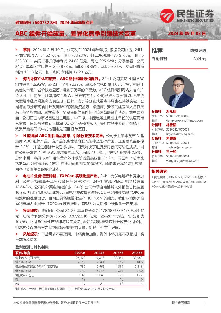 民生证券:爱旭股份(600732)-2024年半年报点评:ABC组件开始放量,差异化竞争引领技术变革.pdf