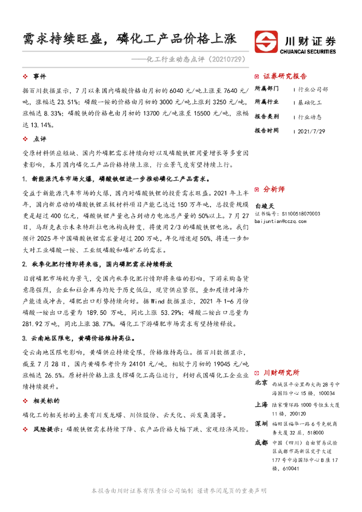 川财证券:化工行业动态点评:需求持续旺盛,磷化工产品价格上涨.pdf