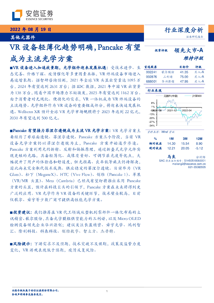 安信证券:其他元器件:VR设备轻薄化趋势明确,Pancake有望成为主流光学方案.pdf