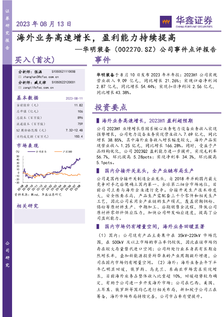 华鑫证券:华明装备(002270)-公司事件点评报告:海外业务高速增长,盈利能力持续提高.pdf