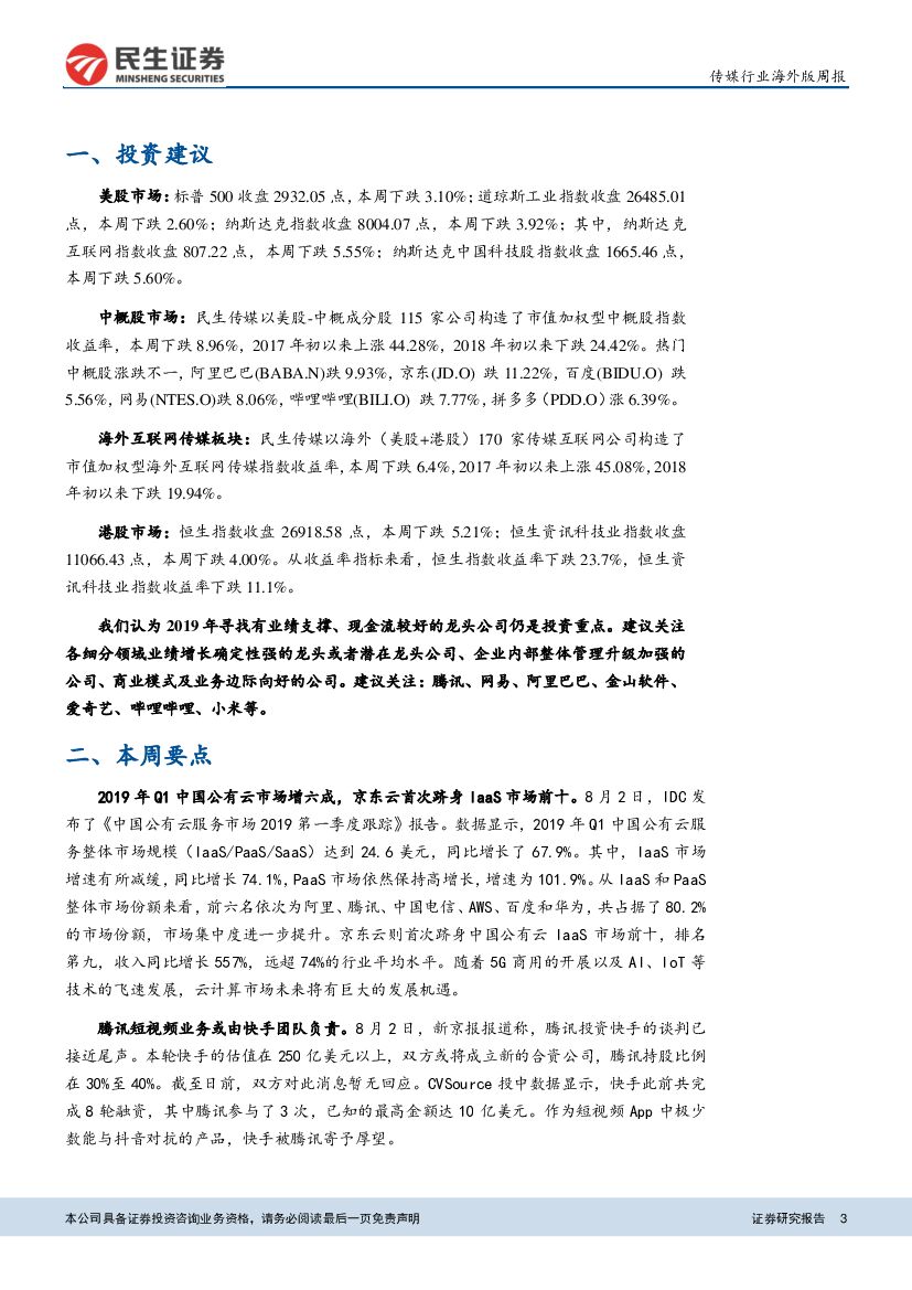 民生证券:海外周报:中国公有云市场快速扩张,腾讯或收购快手发力短视频业务.pdf