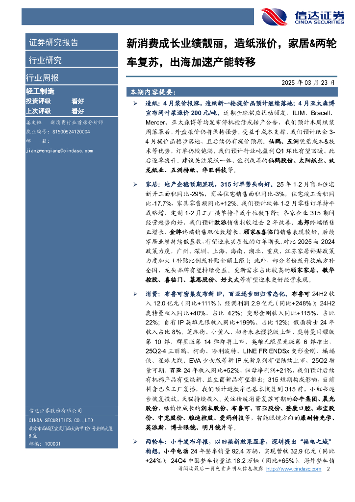 信达证券:新消费成长业绩靓丽,造纸涨价,家居&两轮车复苏,出海加速产能转移.pdf
