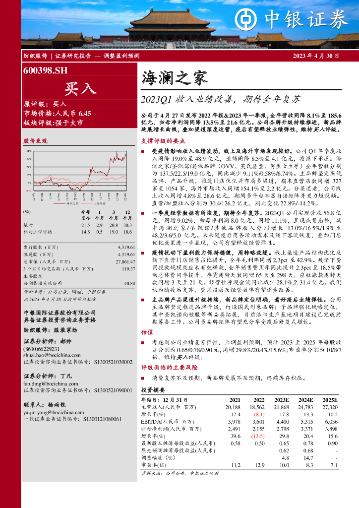 中银证券:海澜之家(600398)-2023Q1收入业绩改善,期待全年复苏.pdf