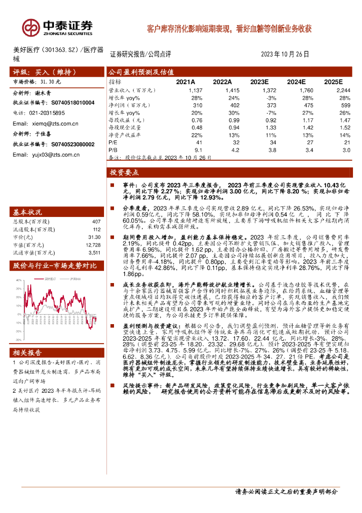 中泰证券:美好医疗(301363)-客户库存消化影响短期表现,看好血糖等创新业务收获.pdf