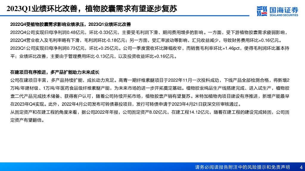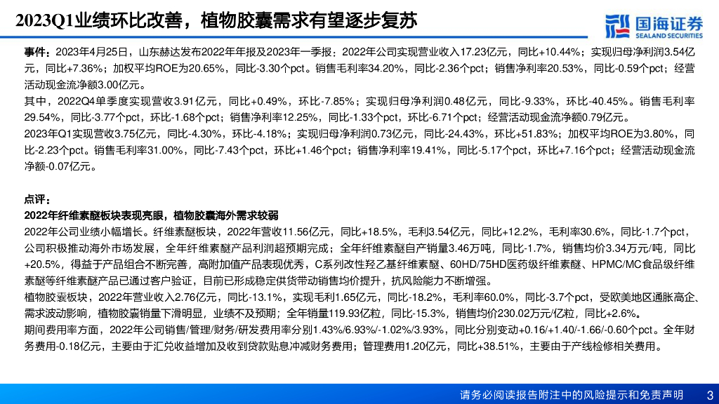 国海证券:山东赫达(002810)-2022年报及2023一季报点评:2023Q1业绩环比改善,植物胶囊需求有望逐步复苏.pdf