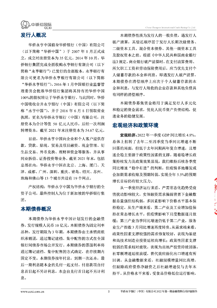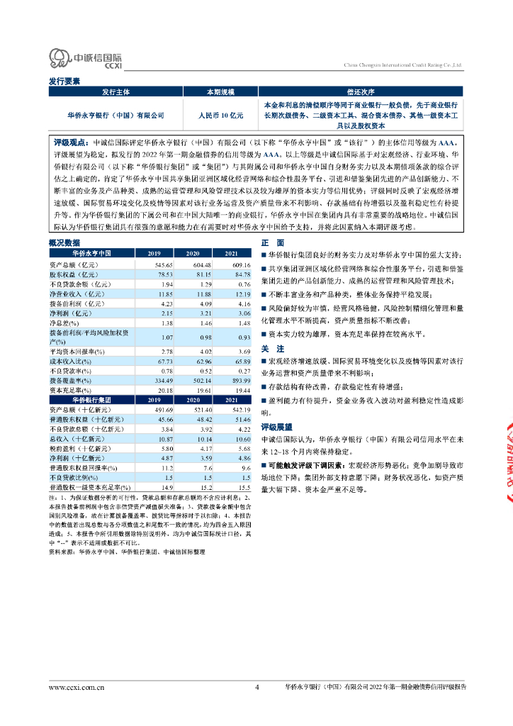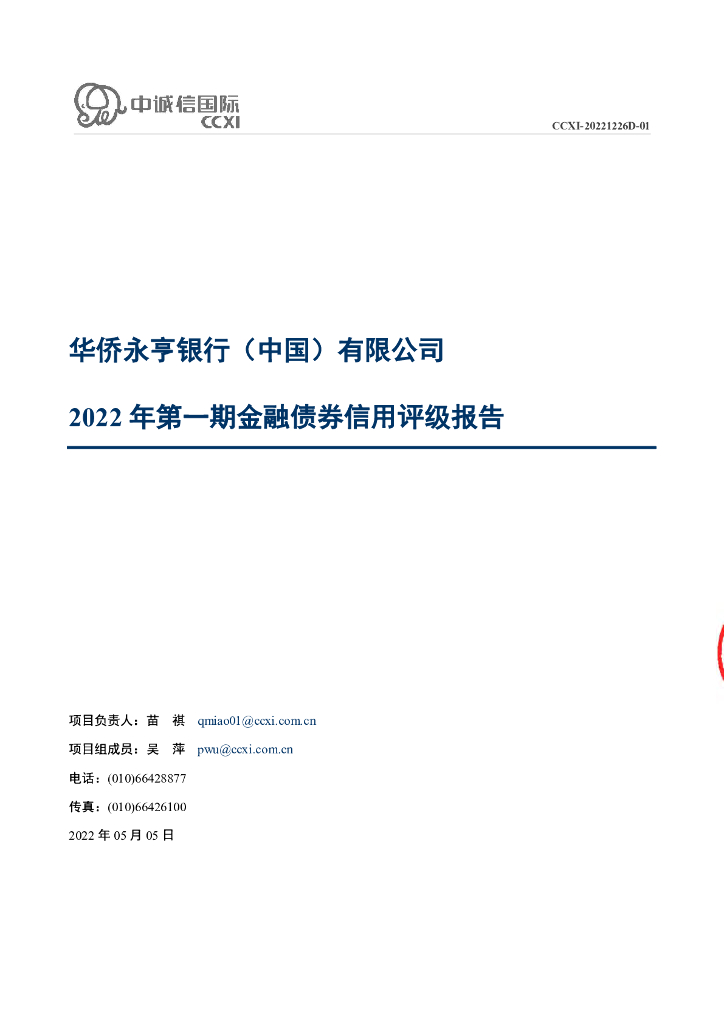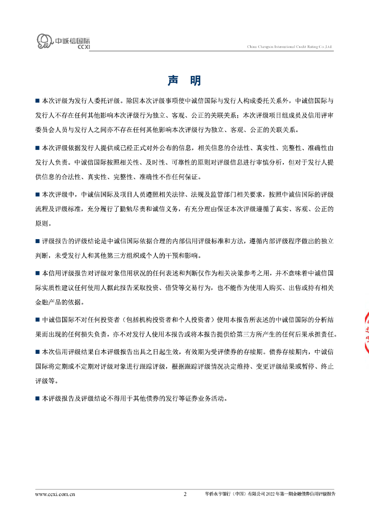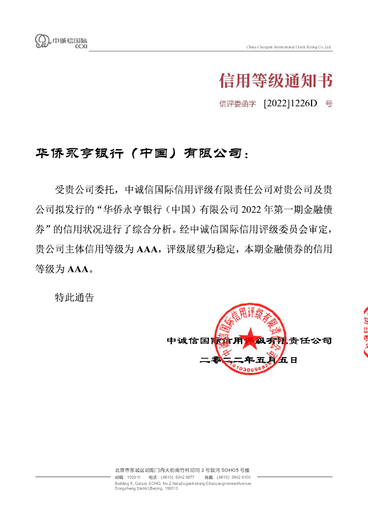 中诚信:华侨永亨银行(中国)有限公司2022年第一期金融债券信用评级报告.pdf