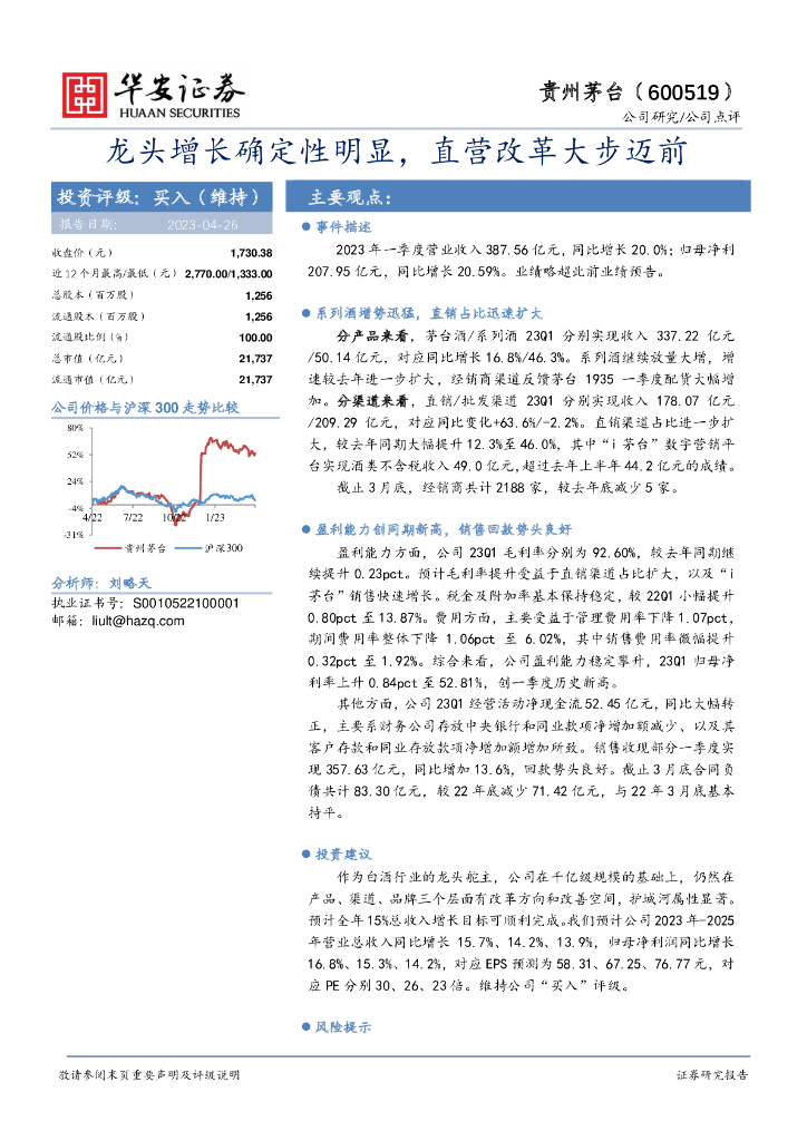 华安证券:贵州茅台(600519)-龙头增长确定性明显,直营改革大步迈前.pdf