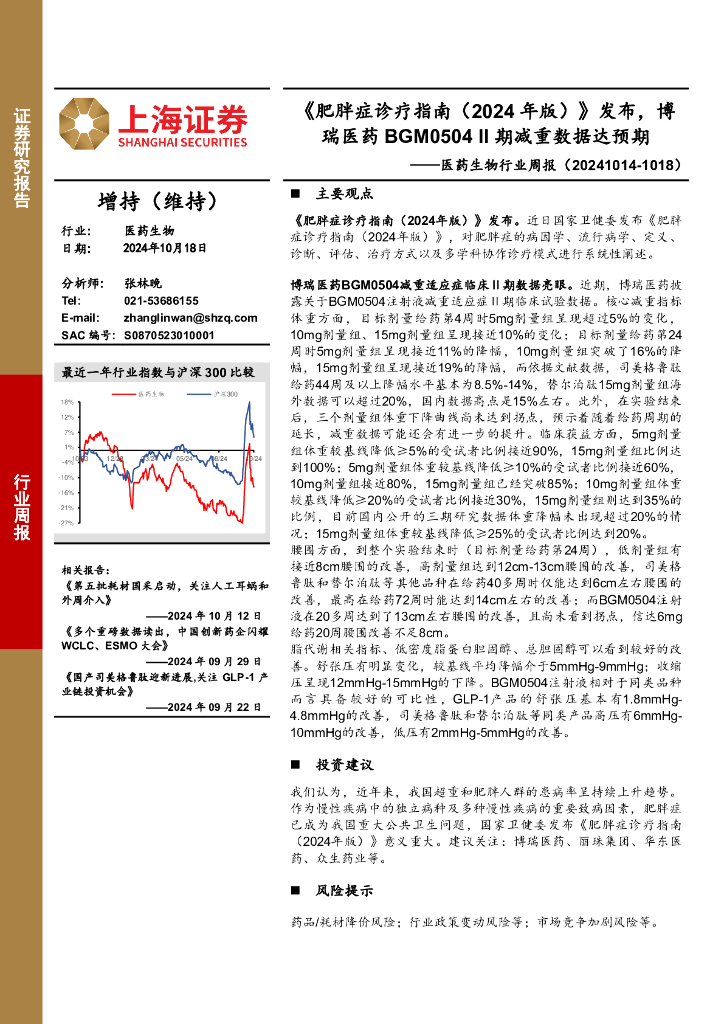 上海证券:医药生物行业周报:《肥胖症诊疗指南(2024年版)》发布,博瑞医药BGM0504II期减重数据达预期.pdf