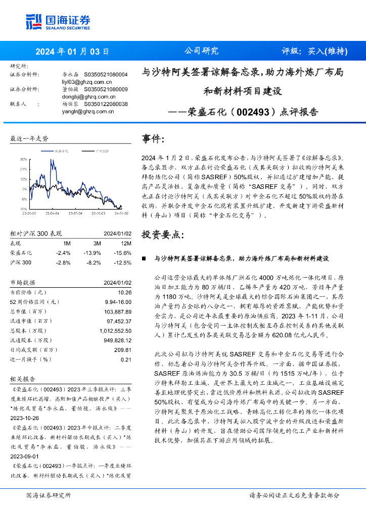 国海证券:荣盛石化(002493)-点评报告:与沙特阿美签署谅解备忘录,助力海外炼厂布局和新材料项目建设.pdf